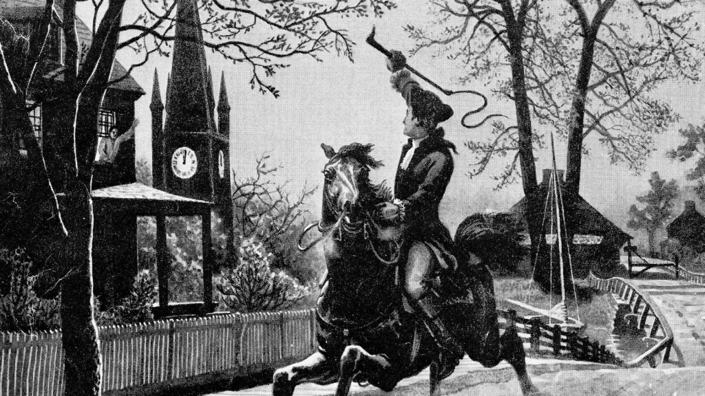 Listen, my children, and you shall hear Of the midnight ride of Paul Revere, On the eighteenth of April, in Seventy-Five: Hardly a man is now alive Who remembers that famous day and year. He said to his friend, — "If the British march By land or sea from the town to-night, Hang a lantern aloft in the belfry-arch Of the North-Church-tower, as a signal-light, — One if by land, and two if by sea; And I on the opposite shore will be, Ready to ride and spread the alarm Through every Middlesex village and farm, For the country-folk to be up and to arm." Then he said good-night, and with muffled oar Silently rowed to the Charlestown shore, Just as the moon rose over the bay, Where swinging wide at her moorings lay The Somersett, British man-of-war: A phantom ship, with each mast and spar Across the moon, like a prison-bar, And a huge, black hulk, that was magnified By its own reflection in the tide. Meanwhile, his friend, through alley and street Wanders and watches with eager ears, Till in the silence around him he hears The muster of men at the barrack-door, The sound of arms, and the tramp of feet, And the measured tread of the grenadiers Marching down to their boats on the shore. Then he climbed to the tower of the church, Up the wooden stairs, with stealthy tread, To the belfry-chamber overhead, And startled the pigeons from their perch On the sombre rafters, that round him made Masses and moving shapes of shade, — Up the light ladder, slender and tall, To the highest window in the wall, Where he paused to listen and look down A moment on the roofs of the town, And the moonlight flowing over all. Beneath, in the churchyard, lay the dead In their night-encampment on the hill, Wrapped in silence so deep and still, That he could hear, like a sentinel's tread, The watchful night-wind, as it went Creeping along from tent to tent, And seeming to whisper, "All is well!" A moment only he feels the spell Of the place and the hour, the secret dread Of the lonely belfry and the dead; For suddenly all his thoughts are bent On a shadowy something far away, Where the river widens to meet the bay, — A line of black, that bends and floats On the rising tide, like a bridge of boats. Meanwhile, impatient to mount and ride, Booted and spurred, with a heavy stride, On the opposite shore walked Paul Revere Now he patted his horse's side, Now gazed on the landscape far and near, Then impetuous stamped the earth, And turned and tightened his saddle-girth; But mostly he watched with eager search The belfry-tower of the old North Church, As it rose above the graves on the hill, Lonely, and spectral, and sombre, and still. And lo! as he looks, on the belfry's height, A glimmer, and then a gleam of light! He springs to the saddle, the bridle he turns, But lingers and gazes, till full on his sight A second lamp in the belfry burns! A hurry of hoofs in a village-street, A shape in the moonlight, a bulk in the dark, And beneath from the pebbles, in passing, a spark Struck out by a steed that flies fearless and fleet: That was all! And yet, through the gloom and the light, The fate of a nation was riding that night; And the spark struck out by that steed, in his flight, Kindled the land into flame with its heat. It was twelve by the village-clock, When he crossed the bridge into Medford town. He heard the crowing of the cock, And the barking of the farmer's dog, And felt the damp of the river-fog, That rises when the sun goes down. It was one by the village-clock, When he rode into Lexington. He saw the gilded weathercock Swim in the moonlight as he passed, And the meeting-house windows, blank and bare, Gaze at him with a spectral glare, As if they already stood aghast At the bloody work they would look upon. It was two by the village-clock, When be came to the bridge in Concord town. He heard the bleating of the flock, And the twitter of birds among the trees, And felt the breath of the morning-breeze Blowing over the meadows brown. And one was safe and asleep in his bed Who at the bridge would be first to fall, Who that day would be lying dead, Pierced by a British musket-ball. You know the rest. In the books you have read How the British regulars fired and fled, — How the farmers gave them ball for ball, From behind each fence and farmyard-wall, Chasing the red-coats down the lane, Then crossing the fields to emerge again Under the trees at the turn of the road, And only pausing to fire and load. So through the night rode Paul Revere; And so through the night went his cry of alarm To every Middlesex village and farm, — A cry of defiance, and not of fear, — A voice in the darkness, a knock at the door, And a word that shall echo forevermore! For, borne on the night-wind of the Past, Through all our history, to the last, In the hour of darkness and peril and need, The people will waken and listen to hear The hurrying hoof-beat of that steed, And the midnight-message of Paul Revere.